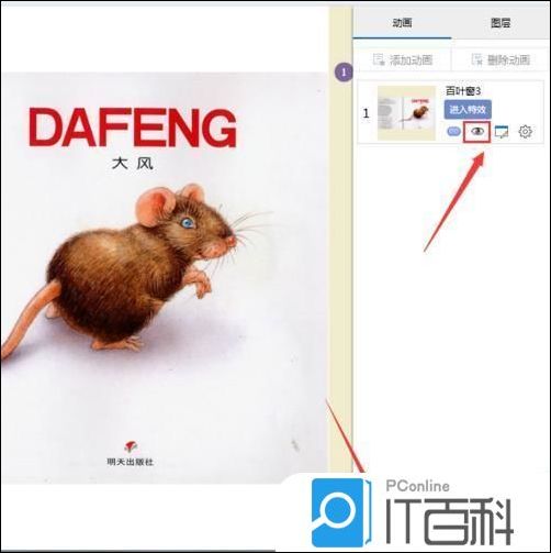 4、我们设置好我们的动画特效过后,我们可以点击预览一下我们的动画效果,这里我们可以点击图中所示的眼睛,或者点击右下角的视频播放图标也是可以的,这两种都是可以达到预览的效果,不过那个播放动画是会播放整个文件。