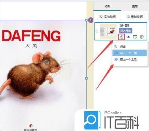 6、我们的动画效果设置好后,接下来就是设置我们进入动画的命令了,也就是说用什么来引导我们的动画,这里我们点击那个鼠标的图标,然后会出现一个下拉选择框,这里我们根据自己喜欢的方式来选择就可以了。
