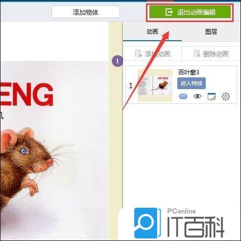 8、最后我们设置完成之后,我们需要做的就是退出我们的动画编辑,这里我们的朋友可能会问,怎么没有保存选项呢? 其实我们点击退出动画编辑就已经默认保存了,如果不需要设置动画 ,就把之前设置的删除然后退出动画编辑就可以了。