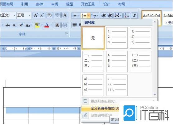 3. 选中第二行,然后依次点击菜单栏:开始→编号库右边小三角→选择定义新编号格式。