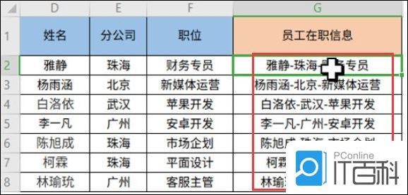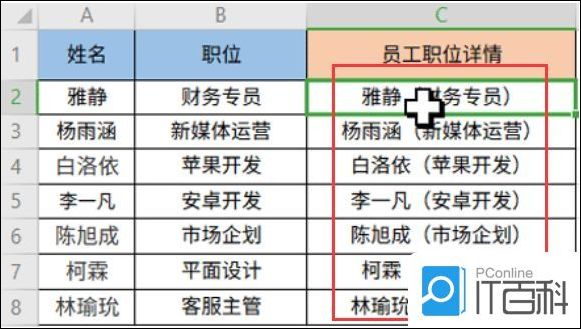 让我们以一家公司的工作表为例。工作和名称是相互独立的。现在,您需要合并这些信息,并要求为位置使用括号。