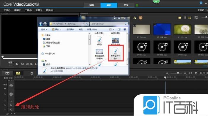 2、打开文件夹,将其中准备调制的音频文件拖到 声音轨道 上。还可以右击声音轨道,直接插入准备调制的音频文件。