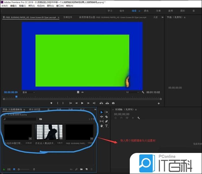 2、在PR的项目文 件管理窗口 中,将我们提前准备好的两段视频媒体和火焰燃烧的视频素材都进行导入到PR中。
