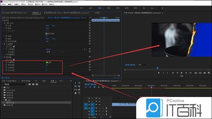 5、选中轨道2的火焰素材,打开效果控件窗口,找到添加的颜色键效果,选择火焰素材中的绿色,然后设置 颜色容差、边缘细化、羽化边缘 的数值使得绿色完全消失即可。