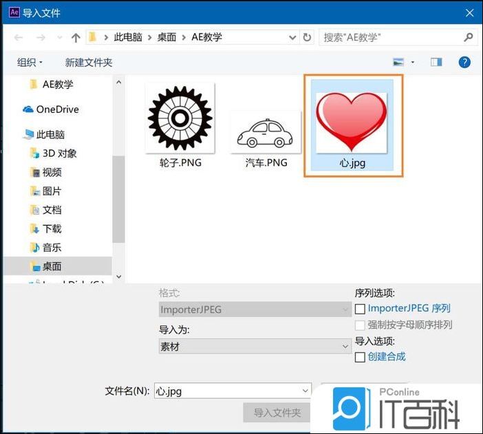 2、按 Ctrl+I 快捷键打开素材导入 对话框, 然后选择心的素材文件,然后选择打开。