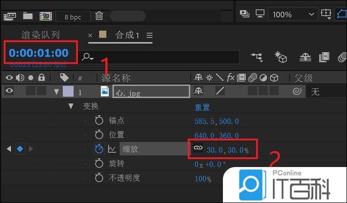 5、将时间轴设置到1秒位置处,然后设置 缩放参数到30%,