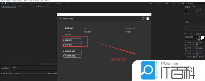 1、启动AE软件之后,在开始页面中选择单击新建项目,有的人打开AE之后可能没有开始界面,那么直接在文件菜单中 新建项目即可。