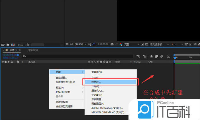 2、在AE合成的图层管理窗口空白处, 右键鼠标 ,然后弹出右键鼠标选项,在右键选项中选择新建中的纯色(比较低的AE版本叫固态层)。
