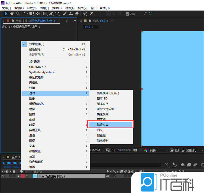 4、找到效果控件窗口, 在效果控件 窗口右键鼠标,找到过时效果中的 路径文本 这个效果,单击添加路径文本这个效果。