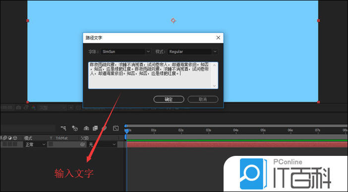 5、单击 路径文本 之后,会打开路径文字窗口,在路径文字中输入文本内容,这里我就随意输入了一些文字。点击确定。