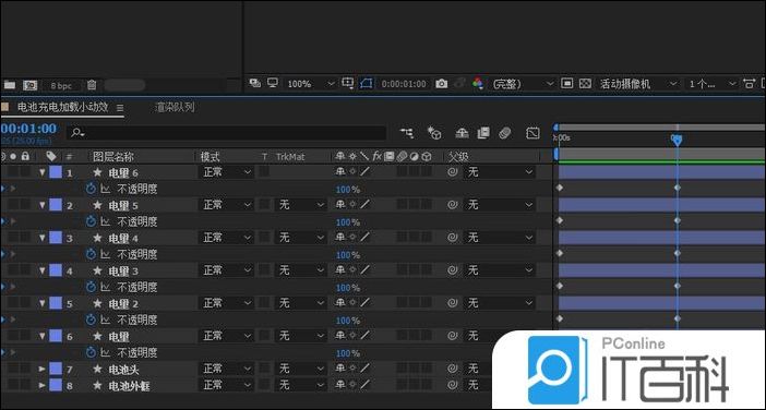 4、选中所有电量图层,按下T键打开 不透明度属 性,在第 0s出k关键帧 ,起始值为0 ,第二帧1s处设置不透明度为100.