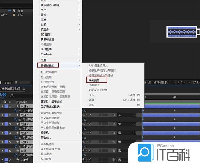 5、我们需要把这些电量在不同时间段的时候显示,所以选中所有电量, 注意选择的时间要至下而上哦 。然后右击关键帧复制选择系列图层, 设置间隔时间。