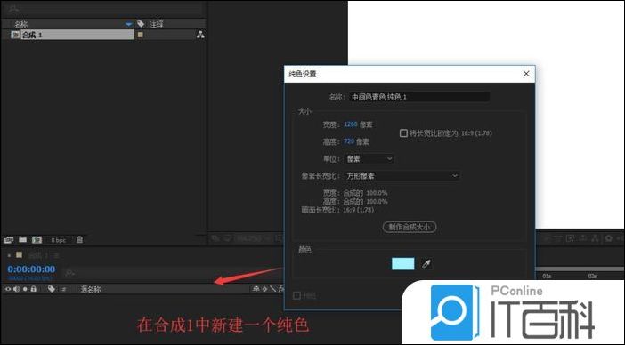 2、在合成1右键单击鼠标,选择 新建纯色 ,弹出纯色设置窗口, 单击纯色设置的色块更改一个颜色作为合成的背景颜色。