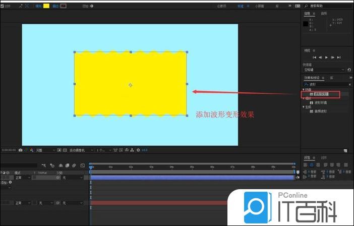 4、选中这个绘制的矩形,在AE内置效果中搜索找到 扭曲 中的 波形变形内置效果 ,并将这个 波形变形 的效果施加给矩形图形。