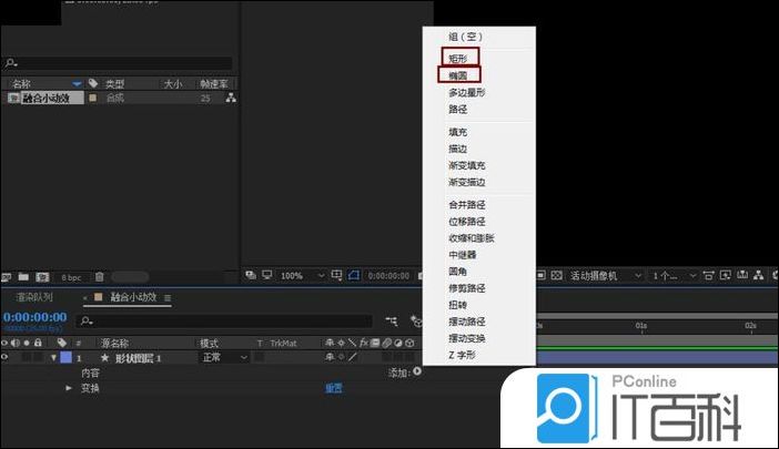 2、在时间线右击新建一个 形状图层 ,添加1个矩形和1个椭圆.添加填充, 将矩形和椭圆填充颜色 。