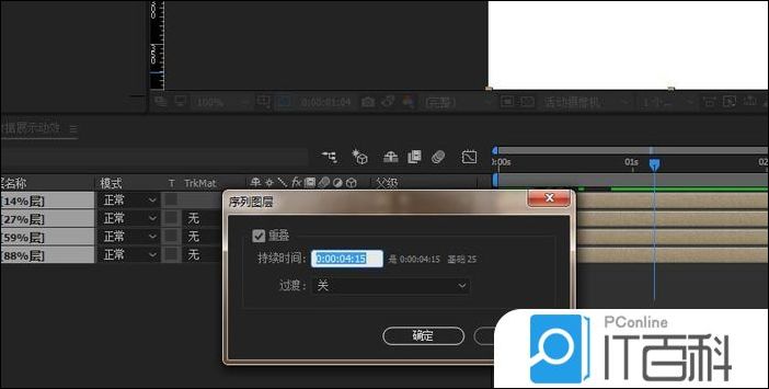 6、然后将一个文字对一个的椭圆图层 ctrl+shift+c 预合成,至上而下的选择四个预合成,右击选择关键帧辅助-系列图层,设置间隔时间,让四个图层错开显示。