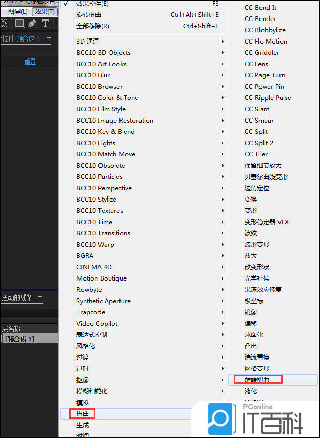 5、选中预合成,添加旋转扭曲效果; 效果-扭曲- 旋转扭曲 ;