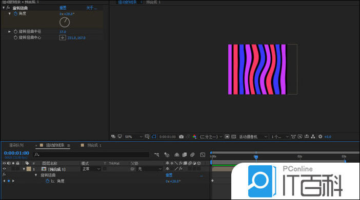 6、调整角度值可以调整扭曲的程度;半径可以控制扭曲的范围;中心点能控制扭曲的位置;我们通过给角度 K关键帧 实现线条扭曲动画;