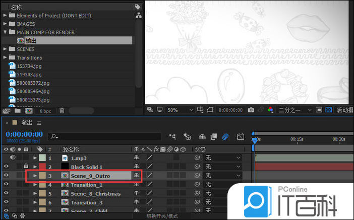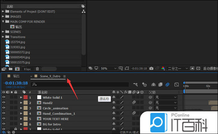 7、如下图所示,我们可以看到当前的【 输出】 合成为当前的主合成