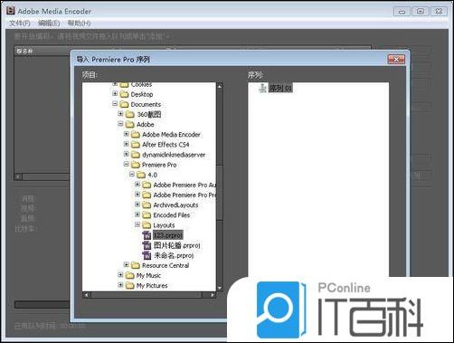 4、现在打开添加,添加你的工程文件,如图所示。ae cs4的文件也可以从这里导入,pr的序列文件后缀为.prproj