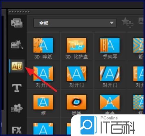 4、接着需要在每张照片中加上转场,点击中间一列图标,如图所示的地方