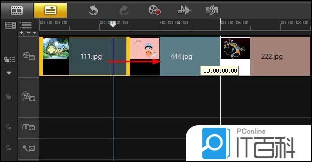 5、如果要移动转场怎么办呢?单击鼠标左键并拖拽至第二张与第三张照片之间释放鼠标左键,即可移动转场效果;