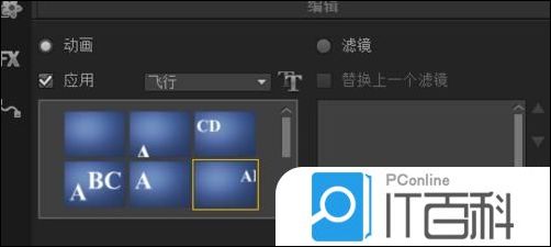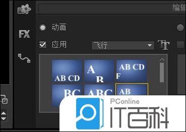 3、选定属性里面的“ 应用 ”,选择“ 飞行 ”动画类型,再选择第二排第三个动画类型,如图所示: