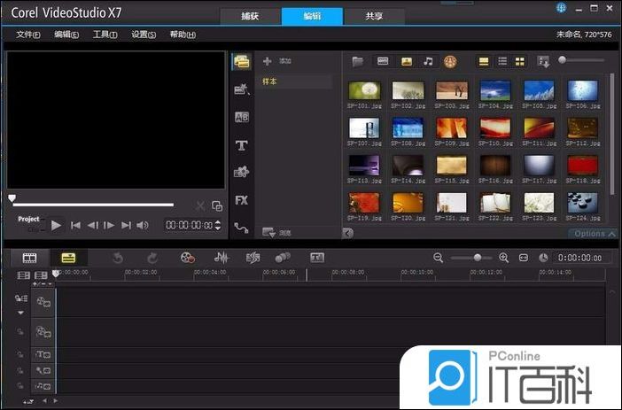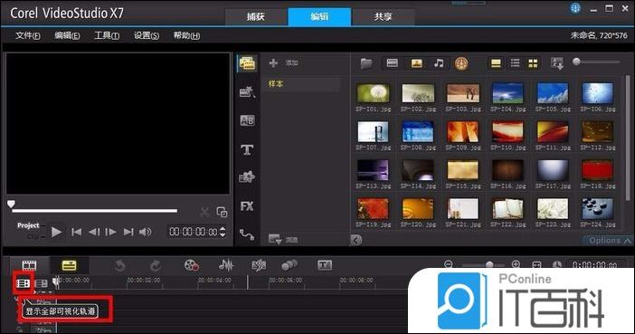 1、首先打开会声会影软件,任意版本都是可以的,这里用的是x7的版本,打开后进入到软件的主界面,下边就是 视频轨 的面板。