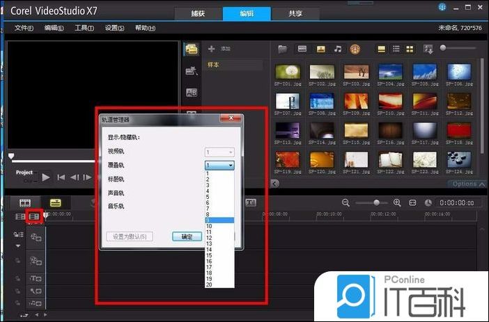 2、在视频轨的左上角有个 加减号的图标 ,点击打开,就会弹出 视频轨道管理器的窗口 ,这里点击 覆叠轨 , 添加9个覆叠轨。