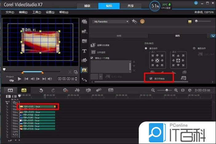 5、接着点击第一个覆叠轨的图片素材,然后在右上的区域会显示设置素材的一些参数,其中有一个 显示 网格线 的选项 ,将其前面打上勾,同时在视频预览窗口就会显示网格线。