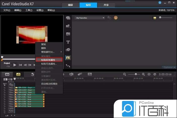 9、设置好之后,右击覆叠轨1的素材,在右键菜单中选择 复制属性 ,然后选中剩余的 8个覆叠轨素材 ,同样右击鼠标,在右键菜单中选择粘贴所有属性,这样9个素材就都加上了一样的边框。
