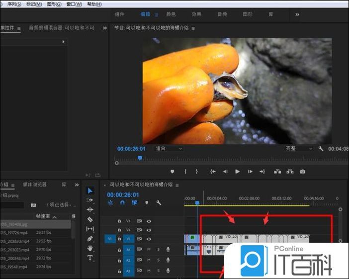 回到时间轴,选中要批量调整曝光的素材片段,看箭头指示,