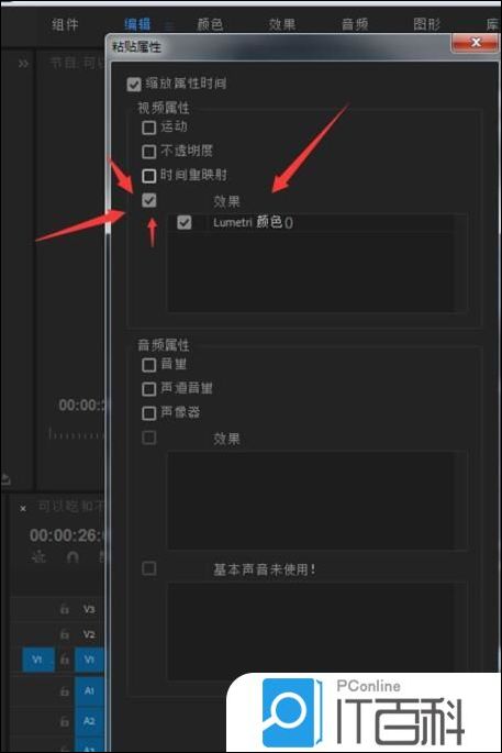鼠标右击,选择【粘贴属性】,弹出粘贴属性窗口,勾选【效果】、【Lumetri颜色】,点击确定,软件即可自动批量调整曝光了。