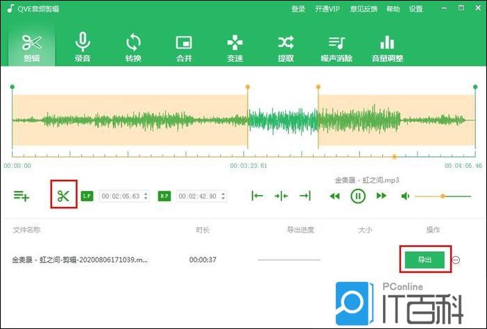 4、接着点击“剪辑”功能,即可在下方看到刚刚截取的音频时长,你可以根据自己的需要截取多个片段,剪切音乐的中间部位就是这么简单!然后再点击导出就完成了。