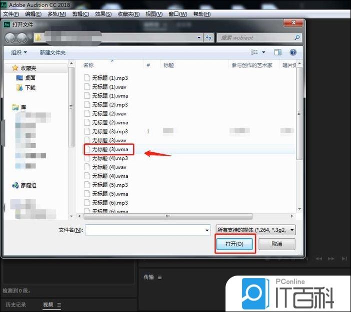 2、在弹出的导入文件窗口中,选择需要的音频素材,点击打开。