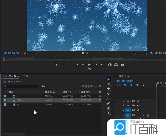 2、新建一个示例项目及序列,导入一些示例的素材文件,如图我导入一个雪花素材的视频文件