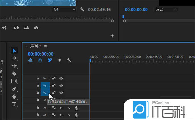 3、如图在序列的轨道左侧区域V1、V2、V3等的位置上,单击鼠标左键即可将当前轨道设置为目标轨道。 成功后会蓝色背景显示。