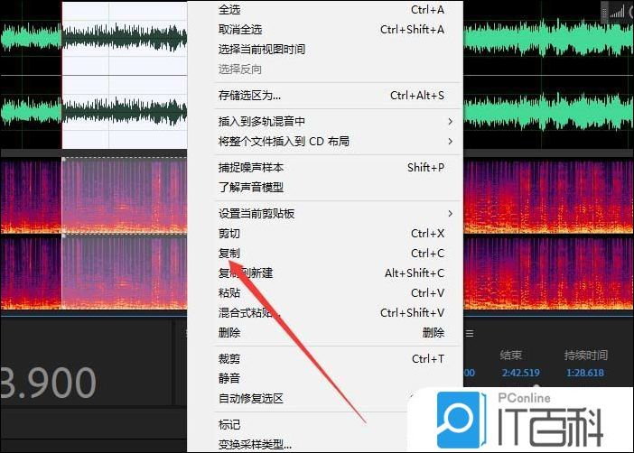 2、先在复制音频文件中先选中要复制的音频片段后单击鼠标右键选择“ 复制 ”选项。