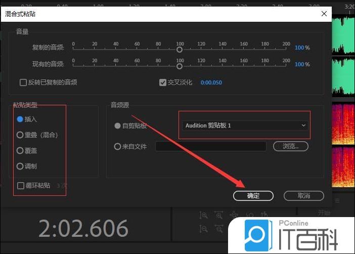 6、打开混合粘贴对话框中在粘贴类型中选择类型与音频来源后单击确定按钮。