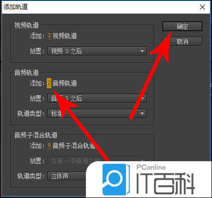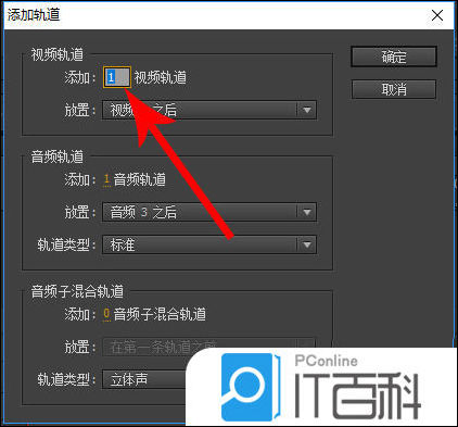 5、然后点击音频轨道的数字1,接着输入想要添加的轨道数2,最后再去点击“ 确定 ”