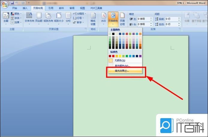 4、点击【背景颜色】选项,在弹出来的子级菜单里找到【填充效果】选项。如下图所示。