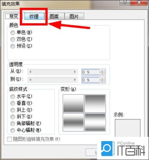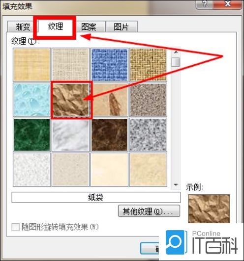 5、点击【填充效果】选项,在弹出的对话框内找到【纹理】选项。如下图所示。