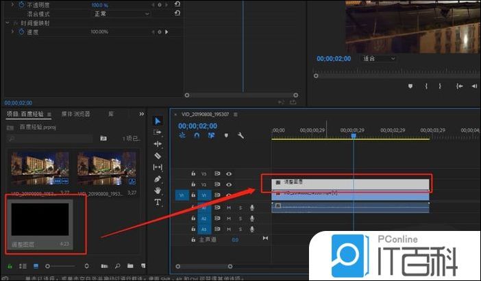 3、在PR项目素材媒体管理窗口中找到新建的调整图层,将这个新建的调整图层拖到序列的视频轨道2上面。