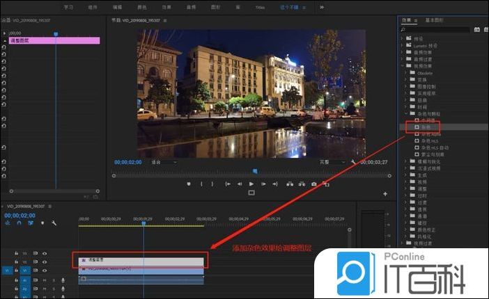 4、打开效果窗口,在效果窗口中找到视频效果中的“ 杂色 ”这一个视频效果,将这个杂色的视频效果拖到调整图层上松开鼠标。