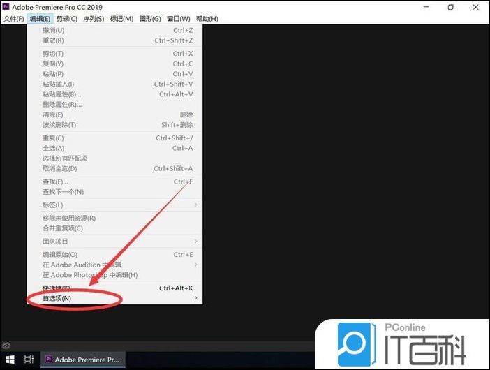 3、打开Pr后,点击软件顶部工具栏上的“ 编辑 ”