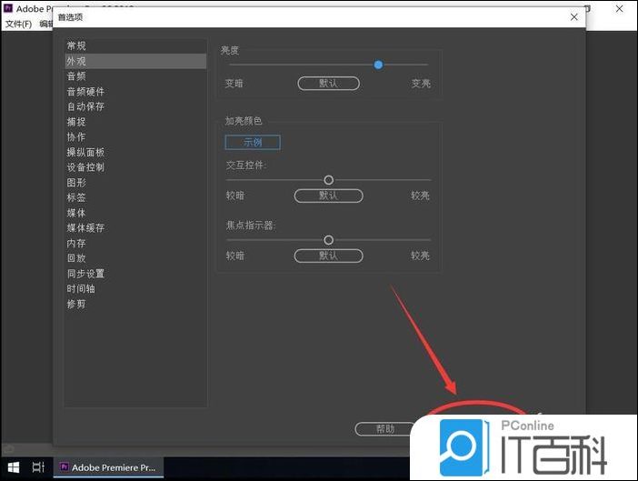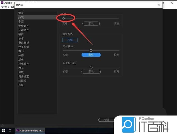 6、打开外观设置后,在亮度一栏中,可以选择Pr外观颜色明暗, 默认是最暗