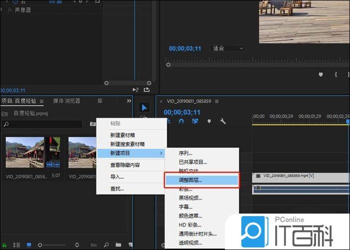 2、在PR剪辑项目窗口空白处单击鼠标右键,在出现的鼠标右键选项中执行 新建中的调整图层选项 。