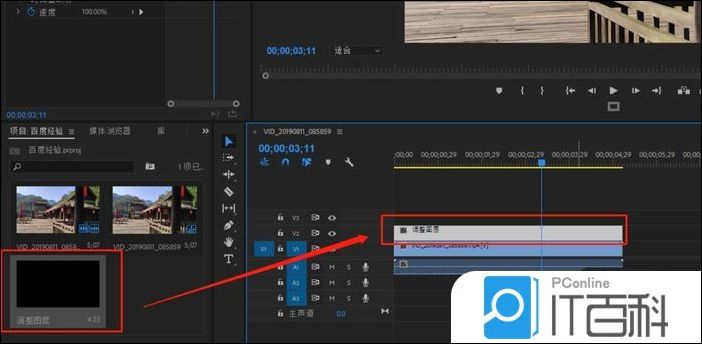 3、选择项目窗口中新建的 调整图层 ,将这个新建的调整图层选中并拖到序列的视频轨道2, 调整时间长度 。