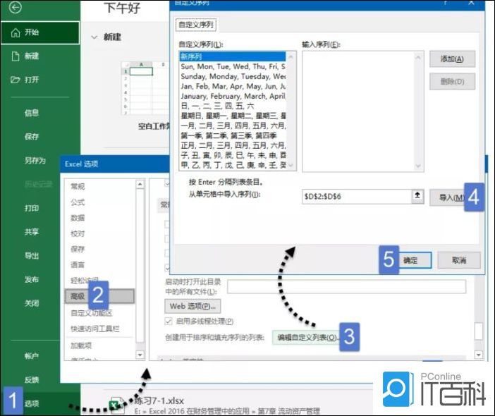 先在单元格中输入自定义的序列,选中,单击左上角的【文件】按钮→【选项】,打开【Excel选项】对话框。