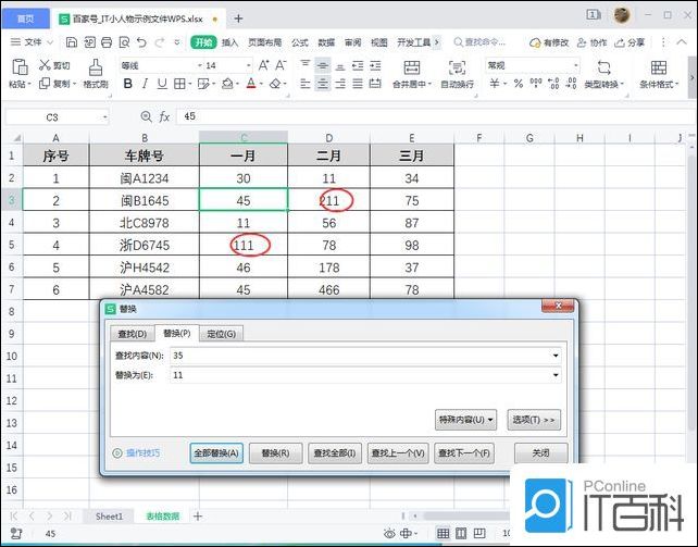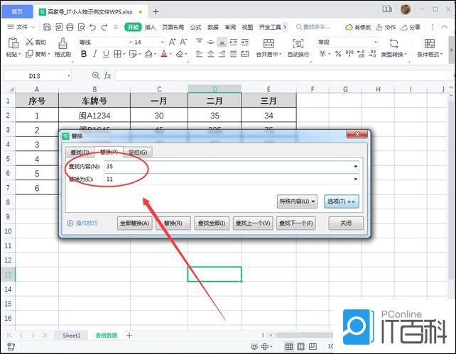 1、以下图中的表格数据为例,要完全替换数字35,而不是包含有35的数字;